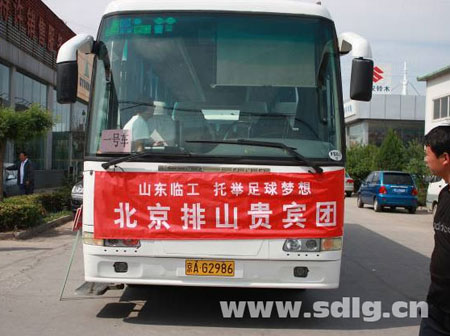 推介会议只是本次活动的一部分,让人惊喜的高潮即将展现。所有与会客户在聚餐之后登上了早已在会场附近等待的4辆大巴车。车队浩浩荡荡开往北京市区,并在下午6时许到达工人体育场北门。在我公司工作人员的精心策划、认真组织下,200名客户服装统一、秩序井然的进入工体会场到达观众席。晚上7:30,山东临工主赞助的中超联赛赛--北京国安VS青岛中能的比赛在北京工人体育场正式开赛。