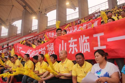 激动人心的赛场上,成了黄色的海洋,客户身着临工醒目的黄色T恤,赛场内巨大黄色临工LOGO,以及体育馆围墙上不的山东临工巨幅广告,配合临工黄色方阵的阵阵呐喊助威,山东临工的口号响彻全场。