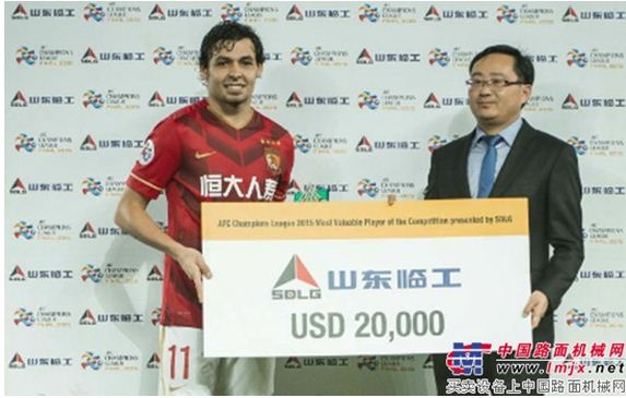 山东临工品牌传讯部部长郭少华向2015年亚冠联赛佳球员、佳射手广州恒大队的高拉特颁奖