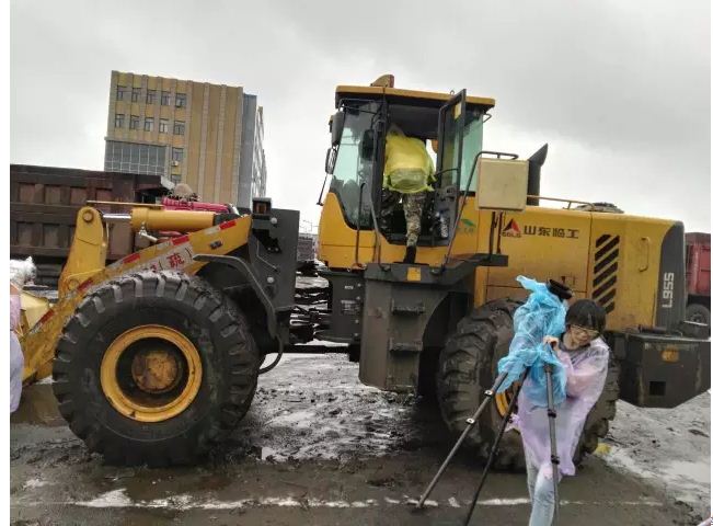 不过再差的环境也没有浇灭机手们的热情,从签到起,大家还是有说有笑的,"平常干活的时候遇到的天气比这还差的都有,哪能影响到我们!"这位仁兄很负责任地告诉我,"天气再差我也能完成我的工作,这点天气怕啥呀!"事后证明,这位仁兄确实麻利,从上车到铲土到倾到,只用了2分钟,火花的相机只拍下他上车的背影!就这他还不满意,他告诉我,"要不是今天的铲车用着不顺手,我速度还能更快一些!"说完就又留下了一个背影~