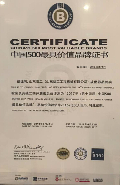 6月22日,2017年《中国500具价值品牌》榜单在“世界品牌大会(World Brand Summit)”揭晓。在基于财务数据、品牌强度和消费者行为分析的年度报告中,山东临工以233.52亿元的品牌价值入围,排名升至176位,品牌价值同比上升34.85亿元。