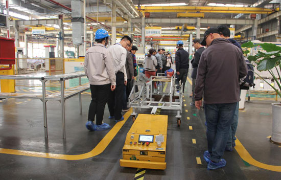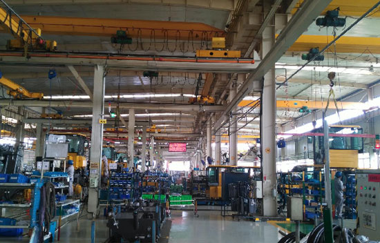 路面机械车间主要承担挖掘装载机、平地机、压路机的关键零部件焊接与整机装配工作,在这里曾装配下线877挖掘装载机、9190平地机等多款临工明星产品。一进车间,地面上的AGV自动配送轨道便跃然于眼前,通过AGV自动导引配送,内部工序便可按需自动化配送,不仅可以减少叉车在车间的使用,还可大幅提升效率。与此同时,针对路面机械产品小批量、多品种的特点,临工在此车间还配备了安灯控制系统,通过安灯系统便可将生产过程可视化,使装配线的设备、质量、交付、技术一目了然。安灯系统还起到警报作用,按下后,应急人员便会在3分钟内赶赴现场解决问题。