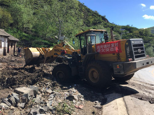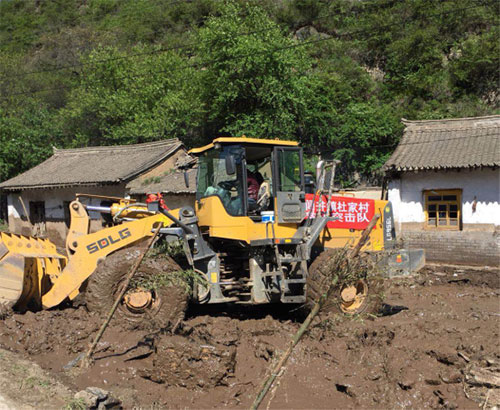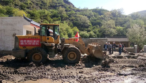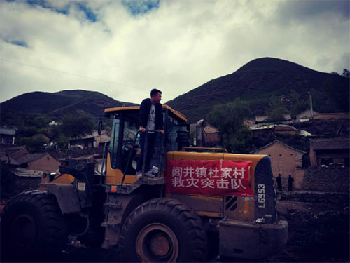 暴雨初停,河水湍急,裹挟着碎石沙粒黄土奔涌咆哮。纪登学带领突击队赶到锁龙乡买家村、寺儿沟、赵家村后,马上开始了清理工作。由于洪水带来了大量的泥沙,受灾村民家中的淤泥太厚,设备不好进入,待人工清理一段时间后,临工装载机正好派上了用场。纪登学他们四人,每人操控一台临工装载机,把淤泥一斗斗的装运出去。