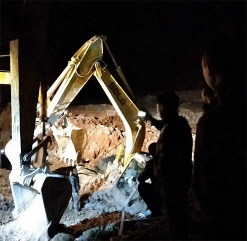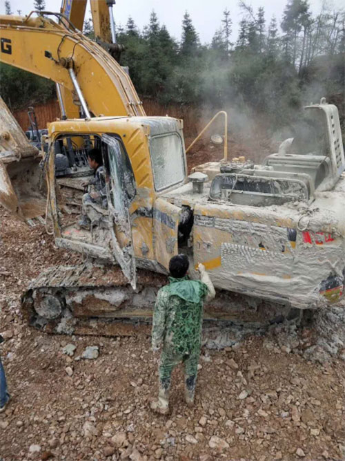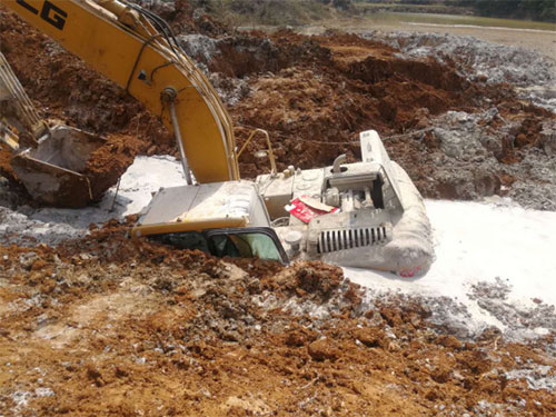 湖南湘西吉*梁先生的临工E6210F挖掘机在铅锌矿尾沙库施工,凌晨两点,恶劣的工况环境加之微弱的光照条件下,挖掘机不幸陷入淤泥之中。