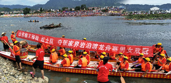 在众多参赛队伍中,有一支身穿红色衣服,头戴黄色太阳帽的队伍格外引人注意,那就是由山东临工助力的“红土队”。他们个个精神焕发,活力十足。红土队顾名思义是红土村代表队,红土村近年走新型农村发展路线,在村委会的组织下,大力发展水果种植、乡村旅游的新型项目,并取得显著成效,村民收入大幅度提高,邻里之间互帮互助,和谐相处。为能够在本次比赛中一展我村新精神风貌,取得优秀成绩,特购买两条新船参加本次比赛,村民积*报名参加,共派出男女两只队伍参赛。