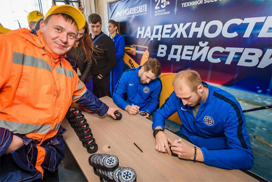 每年有一半时间工作在冰天雪地中的好司机中,自然也缺少不了冰球运动员矫健的身影。以多变的滑冰技艺和敏捷娴熟的曲棍球技艺相结合,以高强度对抗性为代表的集体团队运动,一直以来深受俄罗斯人民的热爱。冰球运动的“文明其精神,野蛮其体魄”,与山东临工的“可靠承载重托”不谋而合,山东临工也有幸成为西伯利亚冰球俱乐部的赞助商。好司机活动现场,冰球队队长同广大客户热情交流,共同分享体育和山东临工精神!