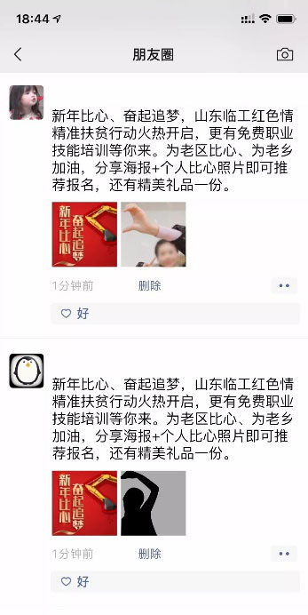 自拍一张比心手势照片,连同“新年比心,奋起追梦“活动海报(长按上图保存至手机)分享至朋友圈,并附文:【#新年比心、奋起追梦# 山东临工红色情精准扶贫行动火热开启,更有免费职业技能培训等你来。为老区比心、为老乡加油,分享海报+个人比心照片即可推荐报名,还有精美礼品一份。】。