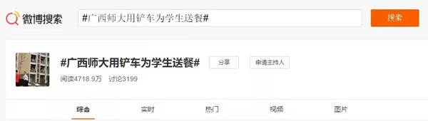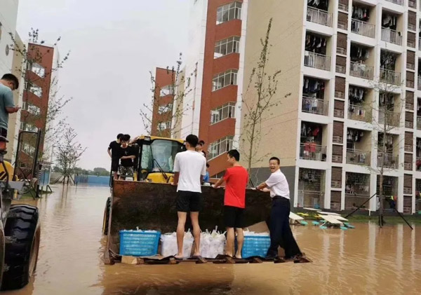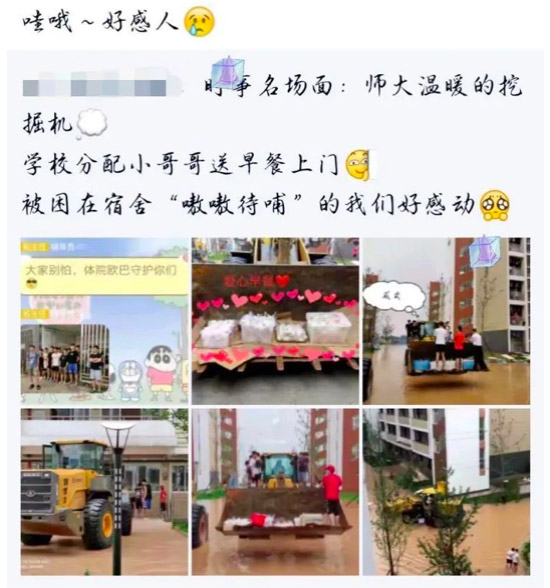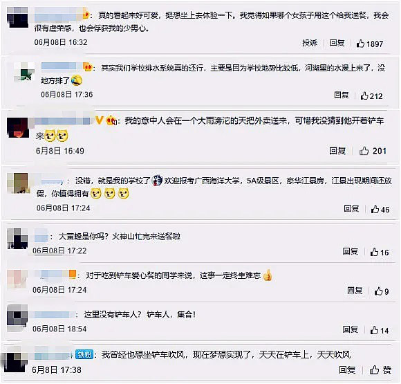 受暴雨影响,学生无法出行用餐,为解决学生的吃饭问题,学校后勤启动铲车送餐和接送充当摆渡车服务,山东临工装载机迎难而上,“一顿操作猛如虎“吸引了一大批迷弟迷妹。昨日(8日),曾在2017年7月登上过微博热搜的“铲车”再次出动,为学生送餐。