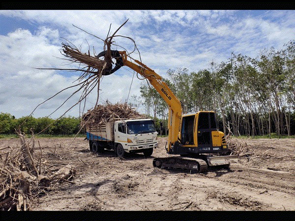 “这片橡胶林产量降低了,现在要把它们清理掉,再种上新树苗。” NATTAPON指着不远处忙个不停的挖掘机说。一台临工E660FL正在把刚挖出不久的橡胶树根装到卡车上。这些树枝、树根将被送到生物发电厂,发挥它们最后的价值。