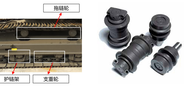 支重轮用来支撑挖掘机的重量,同时在履带的导轨(轨链节)或履带板面上滚动,它还用来限制履带,防止横向滑脱。让履带沿着轮子前进。