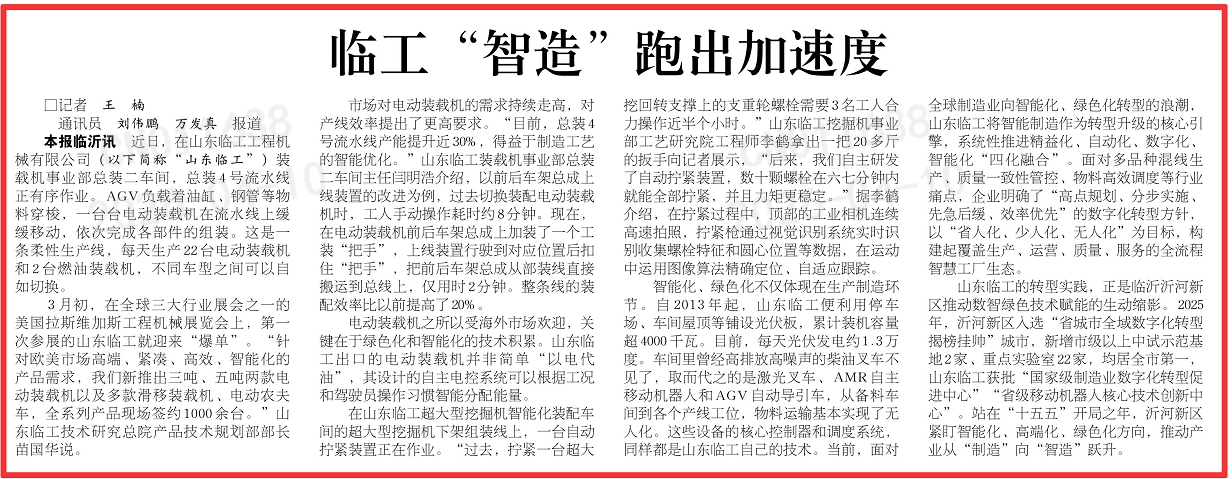 在全球制造业向智能化、绿色化转型的浪潮中,山东临工以智能制造为核心引擎,系统性推进精益化、自动化、数字化、智能化 “四化融合”,用技术创新破解行业痛点,以绿色升级引领产业变革。从柔性生产线的高效运转,到电动产品的海外“爆单”,再到全流程智慧工厂的构建,临工正以硬核实力跑出 “智造” 加速度,书写从 “制造” 到 “智造” 的跨越篇章。今日,《大众日报》刊发深度报道,聚焦山东临工的转型实践,带我们一同见证临工 “智造” 的强劲动能。