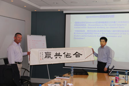 临工南非合作代理商Roger对山东临工的支持和关注表示感谢,同时希望山东临工为南部非洲投入更多的精力,进一步拓展整体非洲市场的渠道系统,以定点分支机构等形式加强同南部非洲的联系,抢占市场竞争的制高点,为临工品牌在非洲市场的崛起提供更加积*的正面力量。